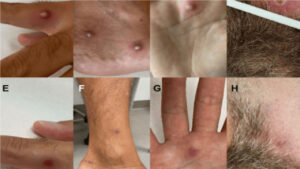 As lesões podem ser dolorosas ou coçar e podem aparecer em qualquer parte do corpo, incluindo rosto, palmas das mãos, solas dos pés, tronco, membros, e de forma muito comum neste surto, nas regiões genitais, anais e dentro da boca. No caso do jovem de Araraquara, o relatório indicou lesões na região genital, tronco, membros superiores e na boca.